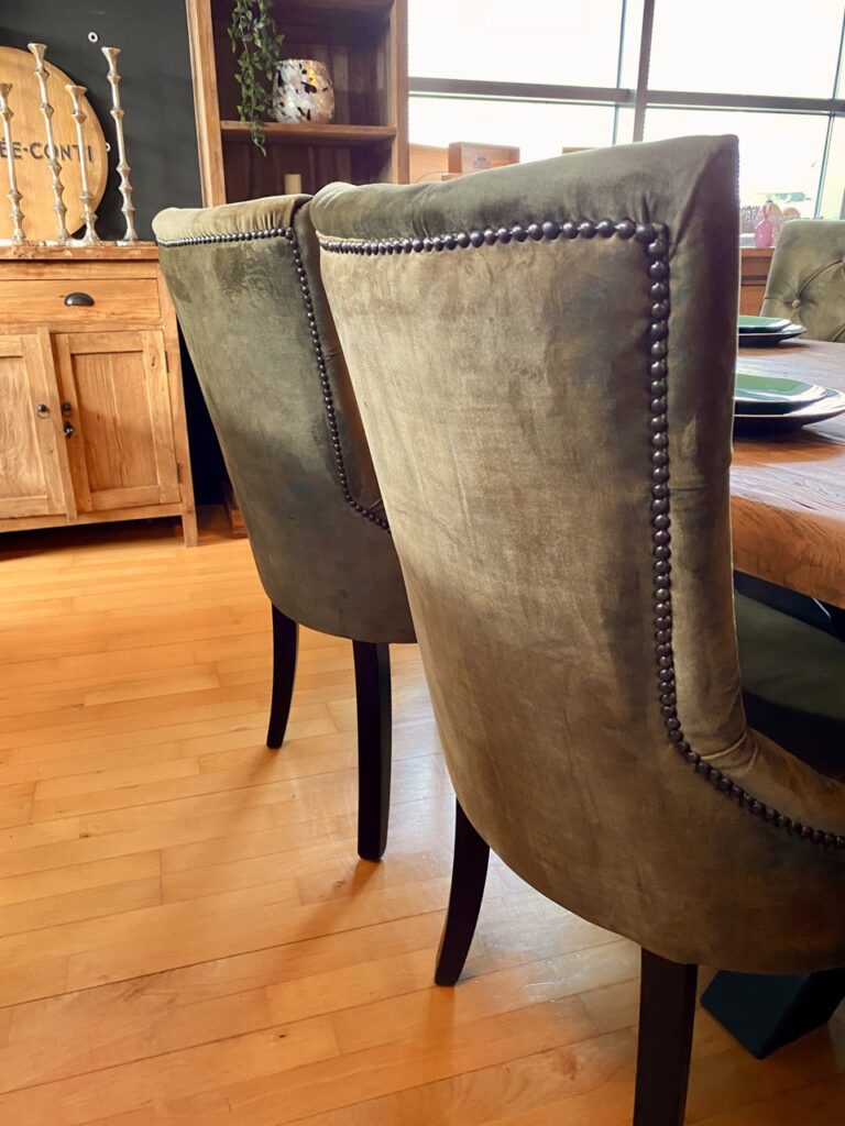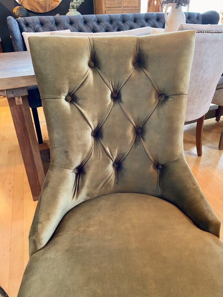 Dieser getuftete Esszimmerstuhl mit hoher Rückenlehne hat einen raffinierten Look. Die Rückenlehne ist mit Nieten ausgekleidet, die für einen sauberen, detaillierten Look sorgen. Erhältlich in einer Vielzahl an Materialien und Farben.