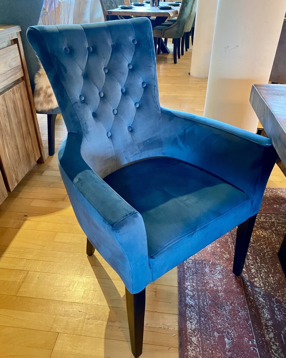 Perfekte Ergänzung zu unseren getufteten Esszimmerstühlen, aber dieses Modell hat Armlehnen. Eine tolle Option für den Kopf des Tisches. Erhältlich in einer Vielzahl von Materialien und Farben.