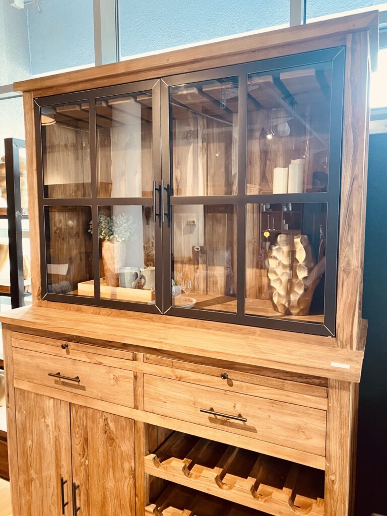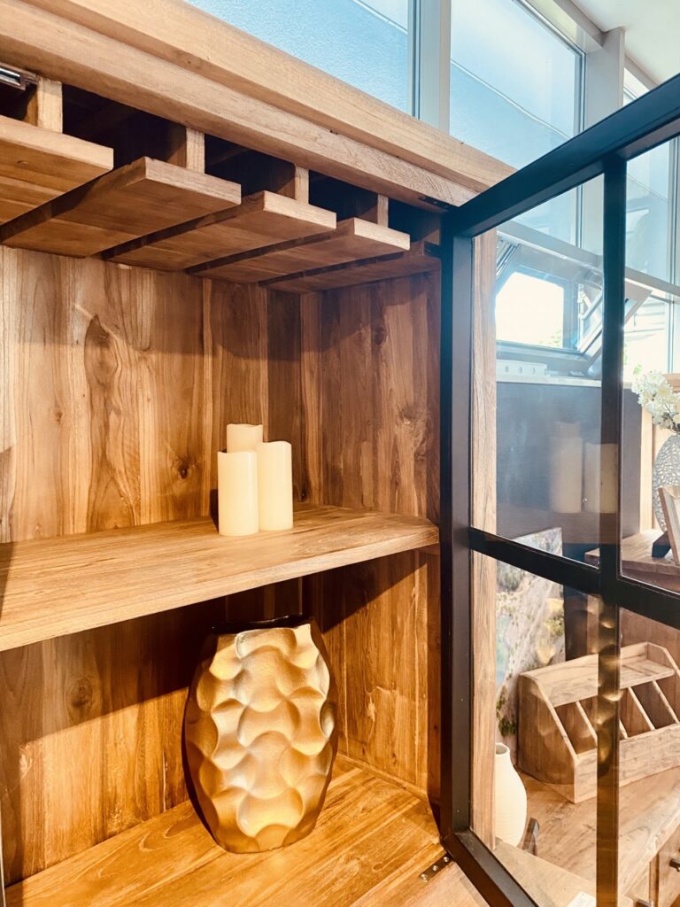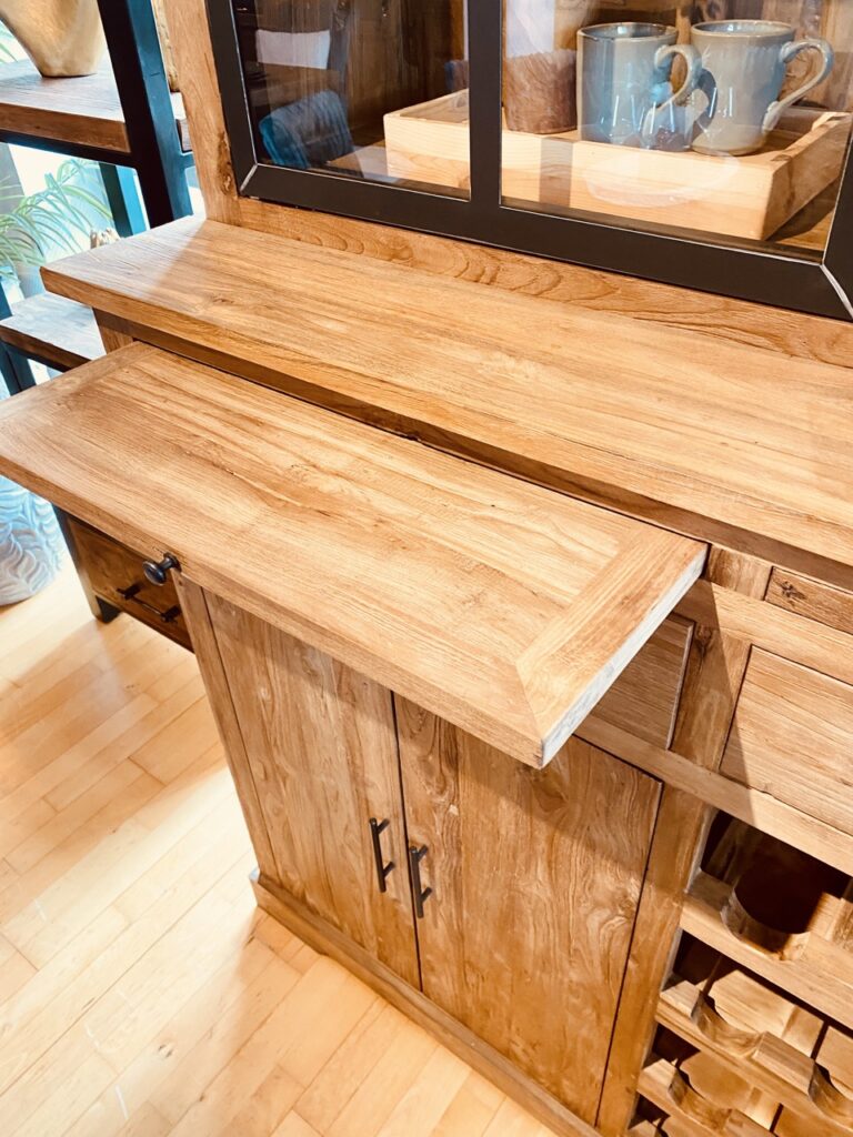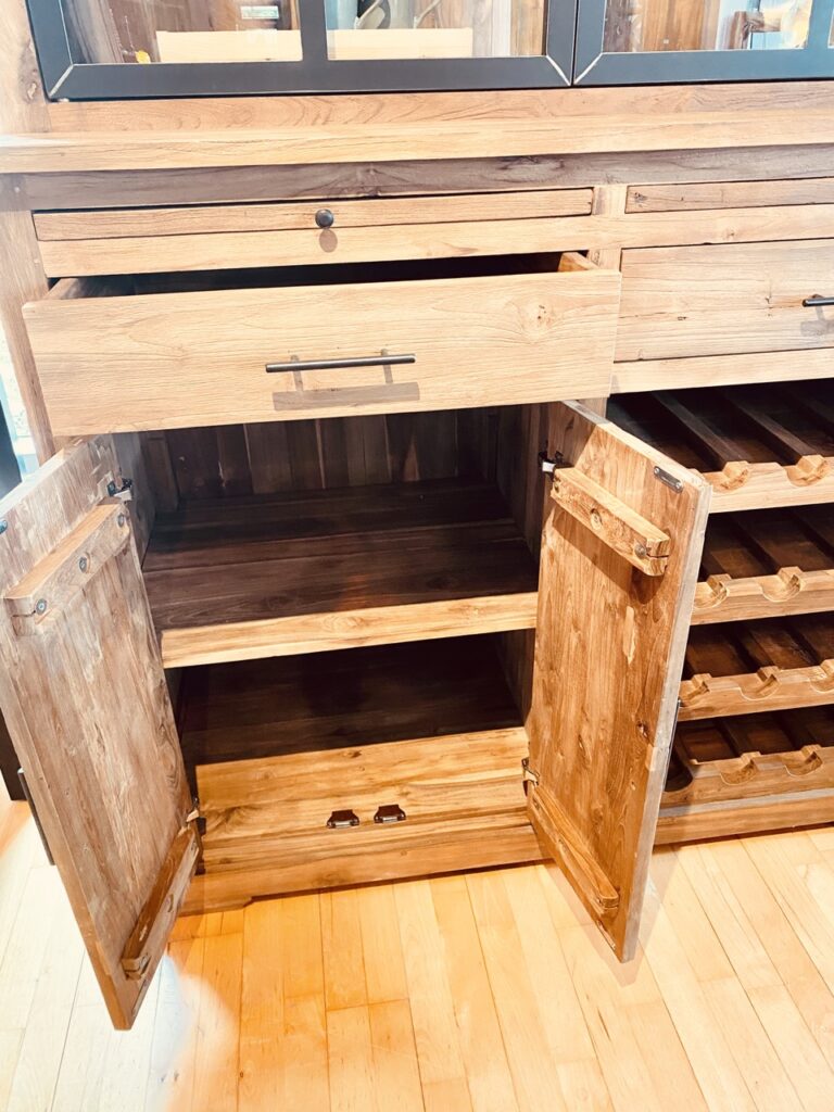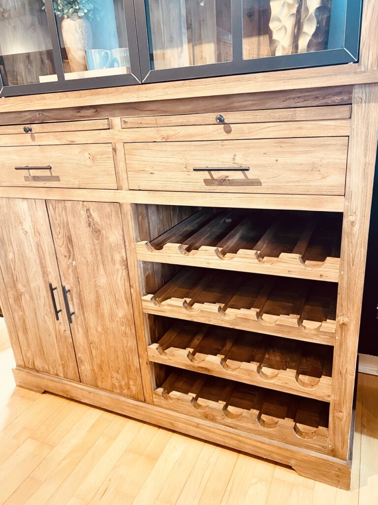 Dieser Schrank wurde für einen Weinliebhaber gemacht! Der obere Teil mit hängenden Weingläsern, die hinter den Glastüren versteckt sind. Unten umgeben versteckte Schubladen und Schränke das vorgesehene Regal zur Aufbewahrung von Weinflaschen. Zusätzlich sind 2 herausnehmbare Bretter eingebaut, um Drinks perfekt zubereiten zu können.