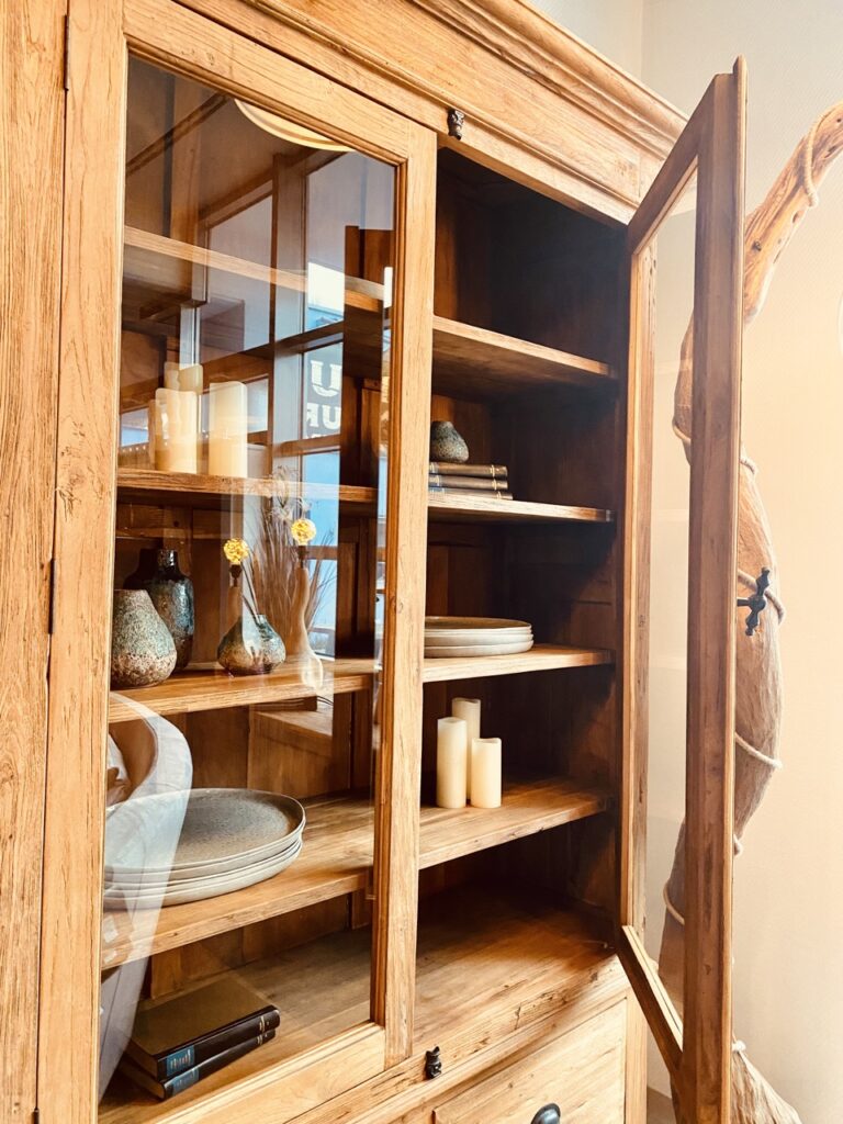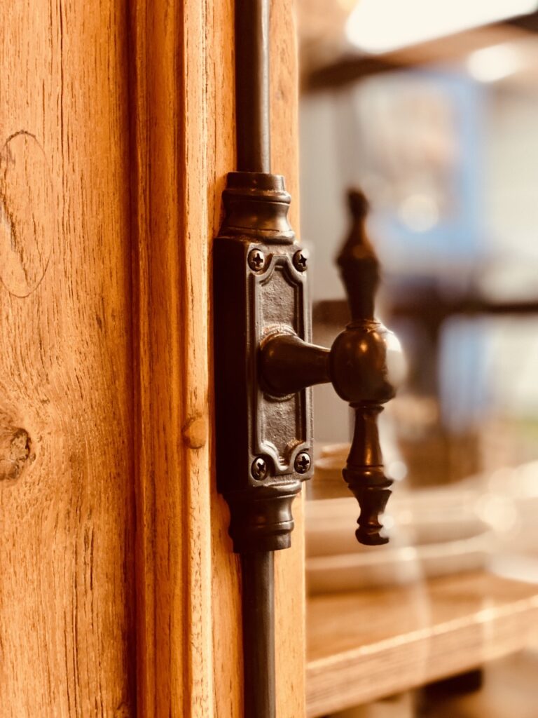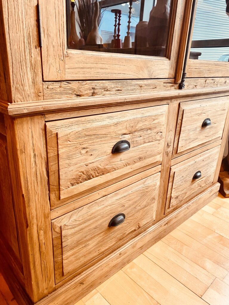 Klassischer Massivholzschrank mit Innenregalen hinter Glasflügeltüren und Schubladen am Boden. Das Metallschloss im Drehstil verleiht dem Schrank Charakter und Charme.
