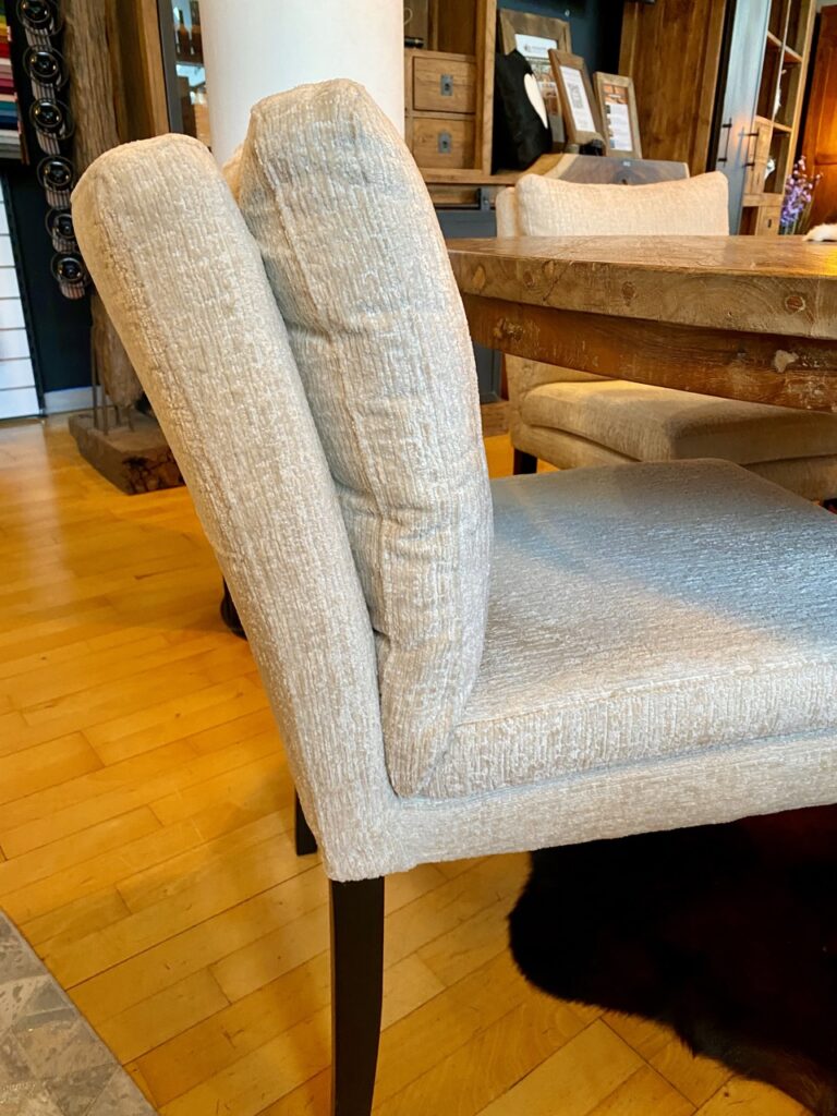 Dieser gepolsterte Esszimmerstuhl ohne Armlehnen hat einen eleganten Look. Gepolsterter Sitz und Rückenlehne bieten ultimativen Komfort. Erhältlich in einer Vielzahl von Materialien und Farben.