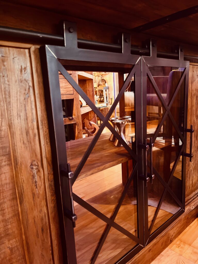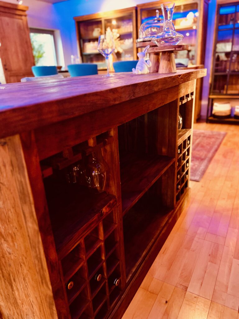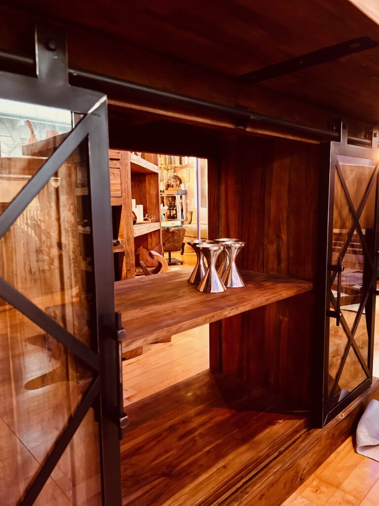Bar table with storage and decorative details. Can be used as a bar or kitchen island. The glass sliding doors make sure you're able to reach everything from both sides. Serve a drink without going all around and show off your treasures!