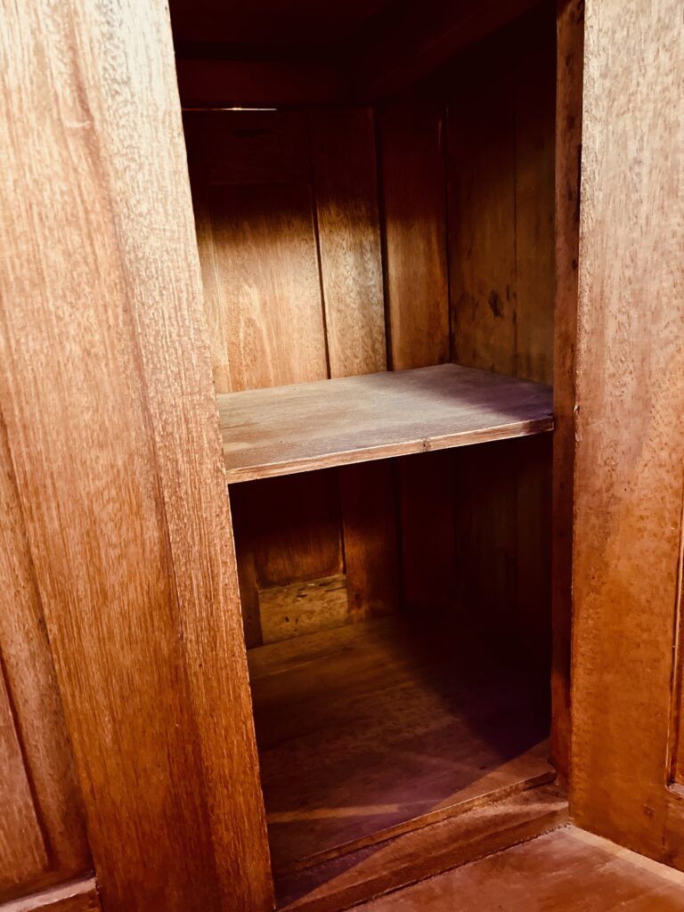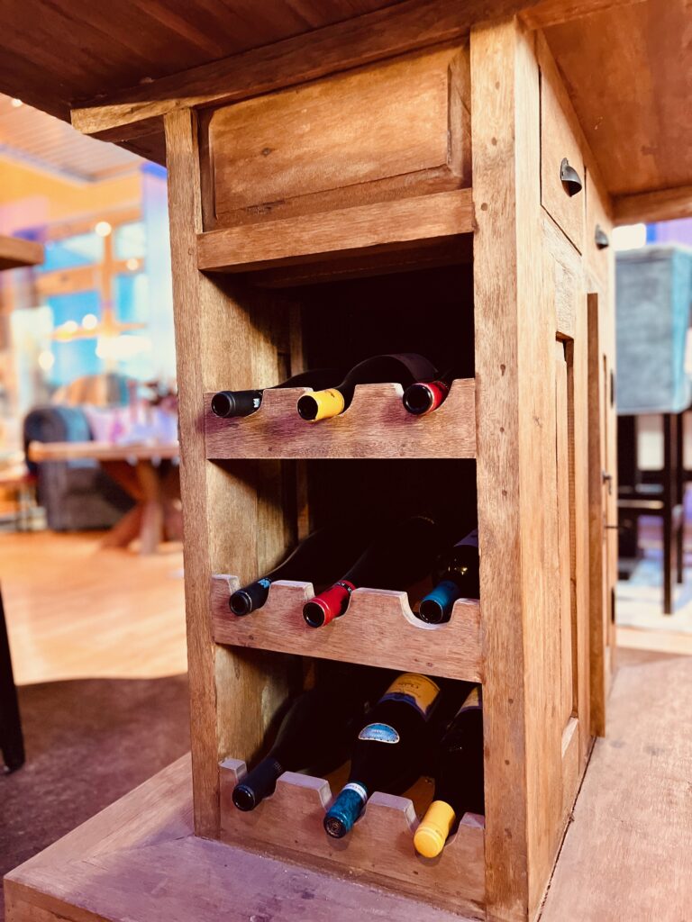 Wooden kitchen island with storage and wine rack. The bar height allows you and your family or guests to stand or sit around the island in a relaxed atmosphere. It can be used both as an addition to the kitchen and as a stand-alone bar.
