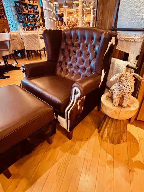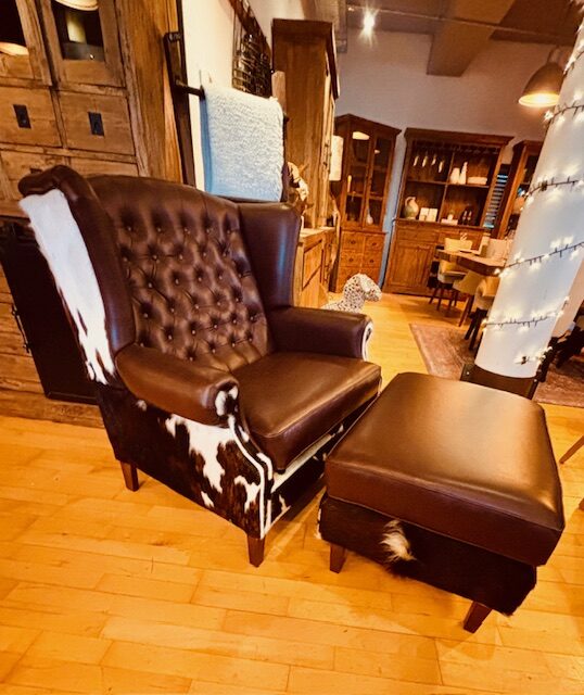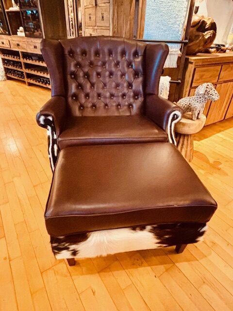 Add comfort and character to your space with this extra-wide, tufted leather chair. This unique piece is accented on the sides and back with multi-color cowhide. A matching ottoman completes the set.