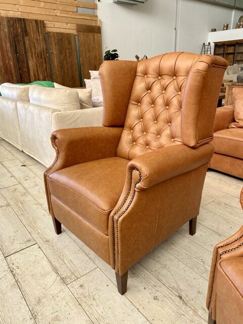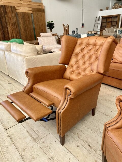 Our tufted armchair, but available with recliner functionality. Can be ordered in other colors and fabrics. Matching ottoman available.