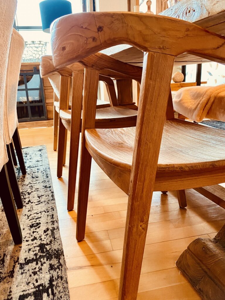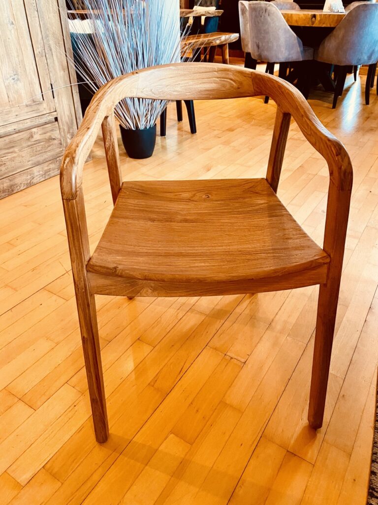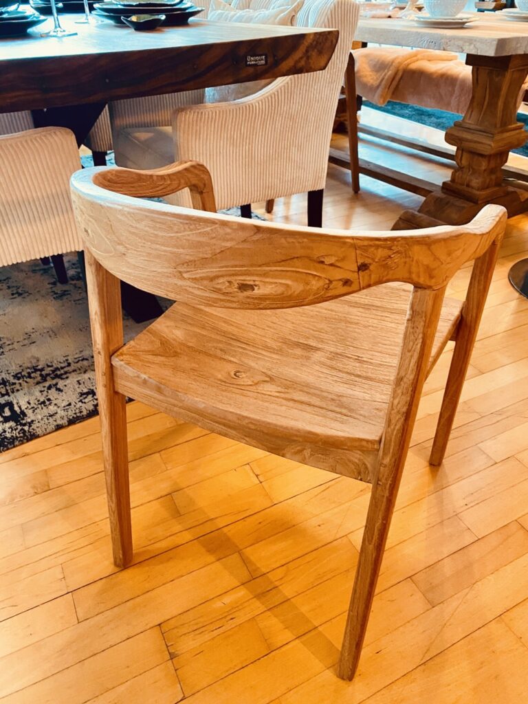 All wood, rounded back dining chair. High arms and continuous shape gives a mid century modern look.