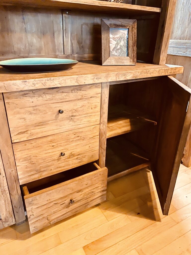 This large buffet cabinet features upper glass door cabinets, middle display shelves, and lower cabinets and drawers. The solid wood shows natural character and craftsmanship that lends itself to a farmhouse look.