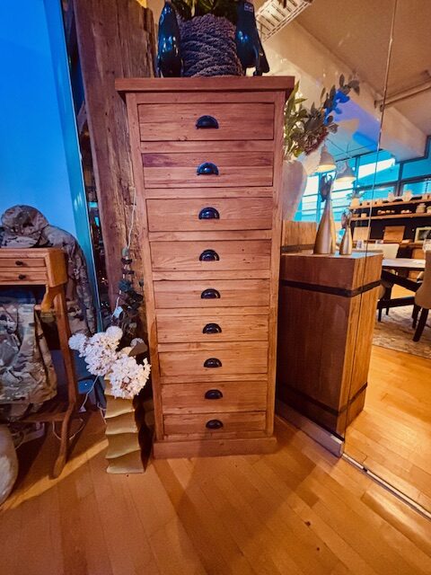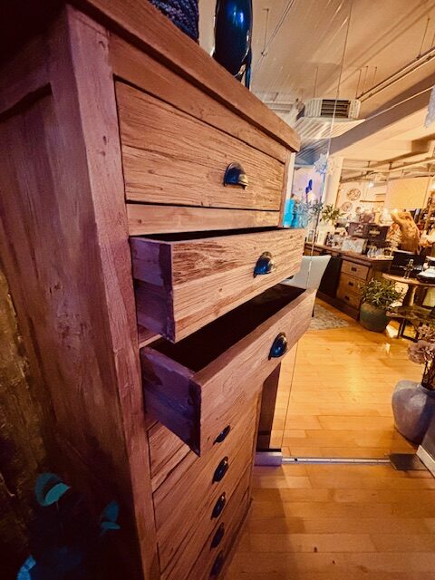 This rustic , reclaimed teak dresser is perfect for smaller spaces. Nine drawers provide ample storage for your everyday needs, complete with classic black metal handles.